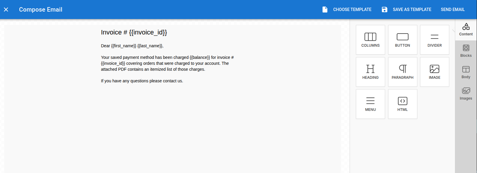 When you process charges for open invoices it starts by opening an email editor with a default template. You can customize the email and save any changes as a template to use in the future.