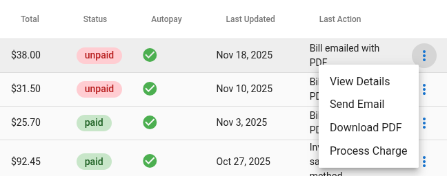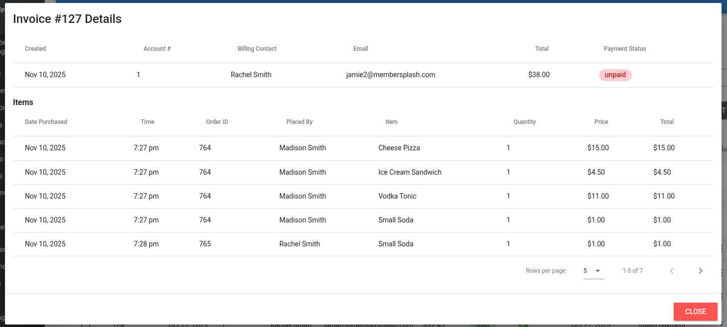 For unpaid invoices if the member has a saved payment method on file you can simply process the charge and they get a receipt. It also includes an itemized PDF of everything that was in the order.