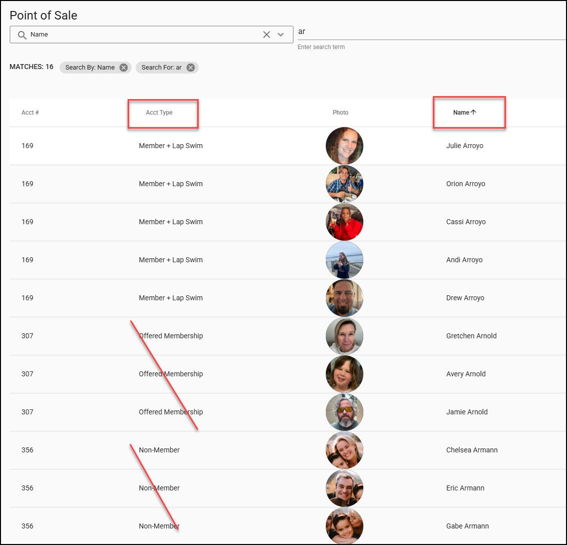 Thanks. I see that Closed accounts no longer are displayed. Great! don’t remember, but did we previously have the option of configuring the search to only display certain account types? For example, we would only want to include Member, Member + Lap Swim, and Volunteer. Also, the sort does not appear to work for Acct Type and Name.