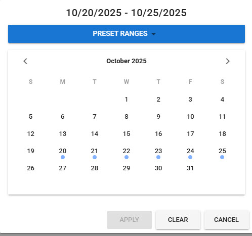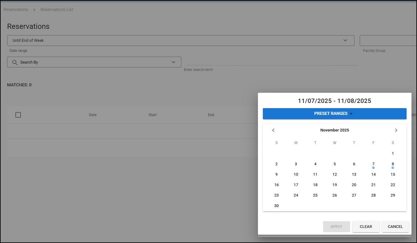 Yet for Reservations → Reservations List, the calendar picker is displayed Sunday-Saturday and the Until End of Week (default) preset ranges ends on Saturday